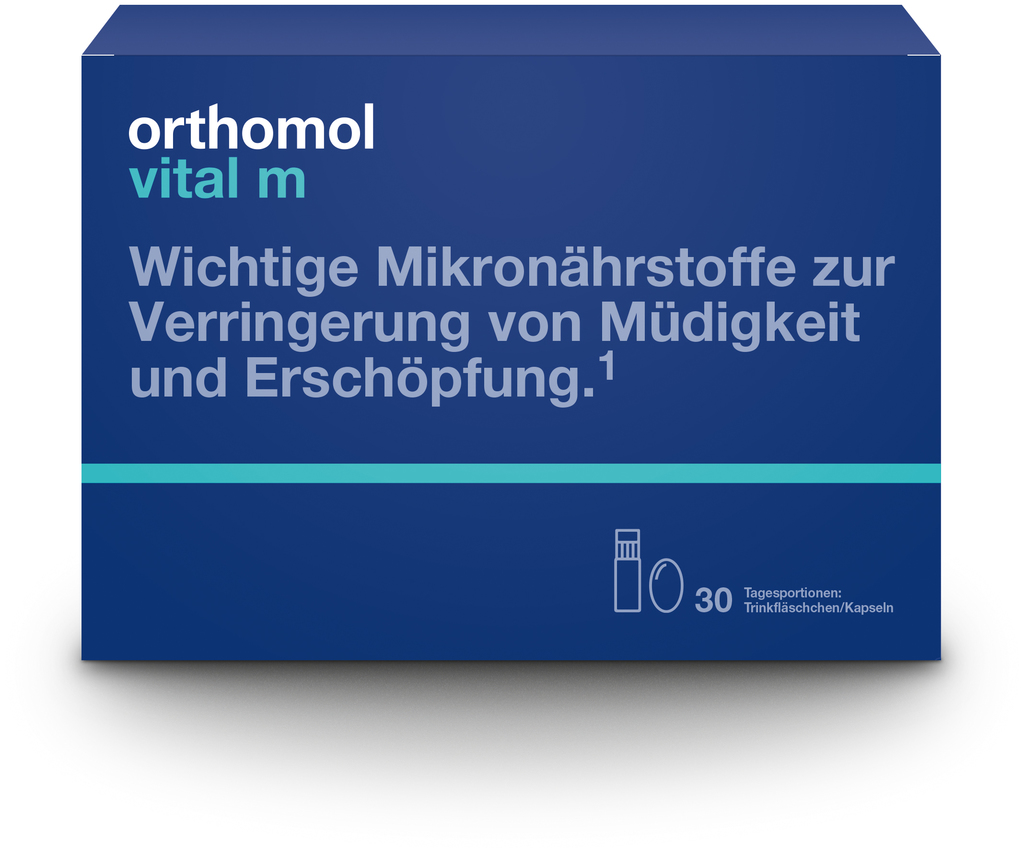 Insbesondere im hektischen Alltag wird eine ausgewogene Ernährung oft vernachlässigt. Wenn die Zeit knapp ist, greifen „Stressesser“ gern zu Fast Food und Süßigkeiten - mikronährstoffarmen Lebensmitteln; „Stresshungerer“ dagegen schränken die Nahrungsaufnahme in solchen Phasen stark ein. Dabei braucht der Körper gerade jetzt, in Phasen hoher Belastung, ausreichend Vitamine und Mineralstoffe, die er größtenteils nicht selbst bilden kann. Orthomol Vital m ist eine Mikronährstoffkombination für Männer. Es enthält wichtige Mikronährstoffe u.a. mit B-Vitaminen und Magnesium zur Verringerung von Müdigkeit und Erschöpfung. Enthält Omega-3-Fettsäuren.