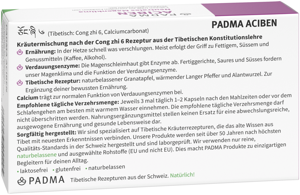 PADMA ACIBEN ist durch eine uralte Rezeptur (Cong zhi 6, tibetisch für: Calciumcarbonat 6) aus der Tibetischen Konstitutionslehre inspiriert. Der Name steht für die sechs Zutaten und das namensgebende Calciumcarbonat.