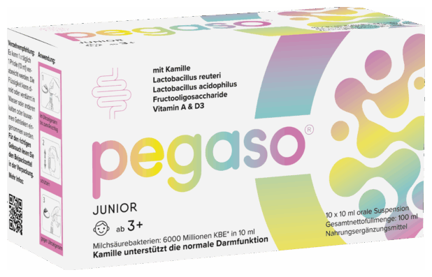 Konkret besteht pegaso® Junior nicht nur aus Milchsäurebakterien, sondern wurde kombiniert mit den stärkenden Vitaminen A für die Darmschleimhaut und D3 für ein normal funktionierendes Immunsystem. Das Nahrungsergänzungsmittel enthält neben den Lactobacillen reuteri und acidophilus auch wertvolle Mikronährstoffe, die der Darmflora dienen. Die Fructooligosaccharide in pegaso® Junior zählen zu den Präbiotika: Für die Milchsäurebakterien schaffen sie somit eine einladende Umgebung im Darm. Ergänzt um den natürlichen Kamillenblüten-Trockenextrakt kann jedes Fläschchen pegaso® Junior auch einen pflanzlichen Beitrag für das Wohlbefinden im Magen und Darm Ihres Kindes leisten.