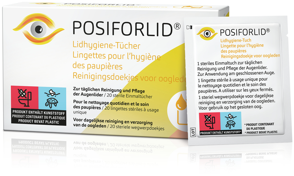 Empfindliche Lidränder brauchen eine tägliche Reinigung und Pflege: POSIFORLID® Lidhygiene-Tücher sind vorbefeuchtete, sterile Einmaltücher zur sanften Entfernung von Ablagerungen wie z. B. Staub, Pollen und Verkrustungen auf den Augenlidern oder zwischen den Wimpern.