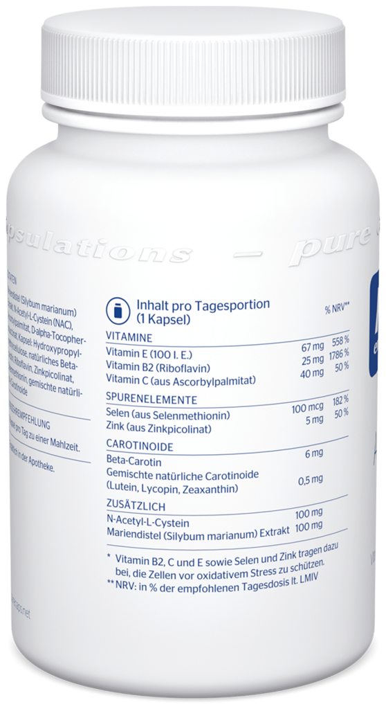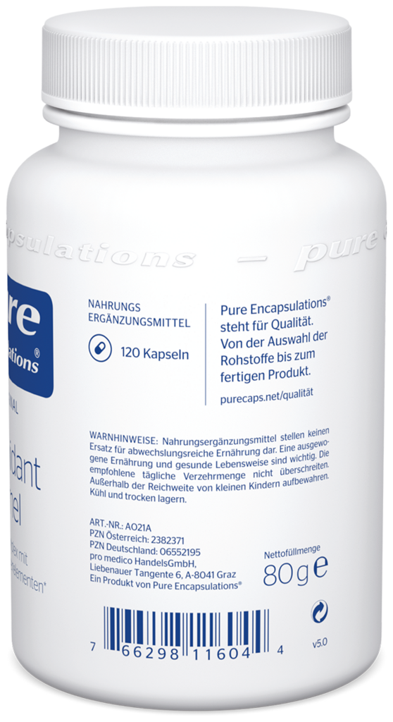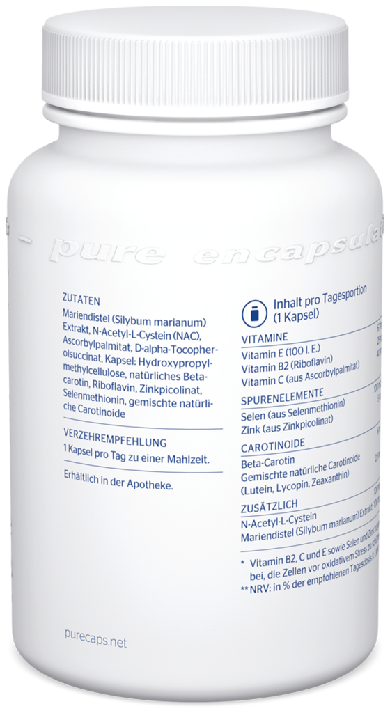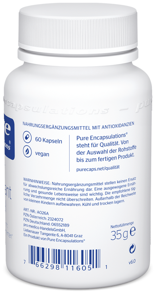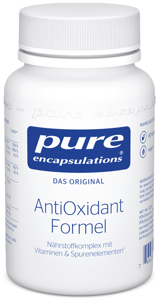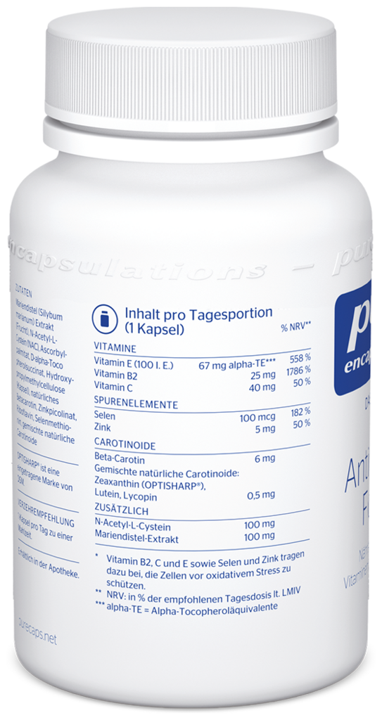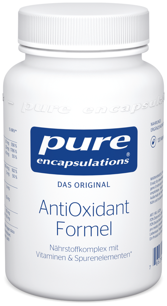 Die AntiOxidant Formel von Pure Encapsulations© hilft dir, deinen Körper vor oxidativem Stress zu schützen. Zusätzlich können Antioxidantien deinem Immunsystem extra Unterstützung bieten oder einer gesunden Haut unter die Arme greifen. Die Vitamine C und E sowie das Spurenelement Zink in der AntiOxidant Formel wirken antioxidativ und können dich so vor oxidativem Stress schützen. Das enthaltene Mariendistel-Extrakt unterstützt zusätzlich eine normale Funktion der Leber und Galle.