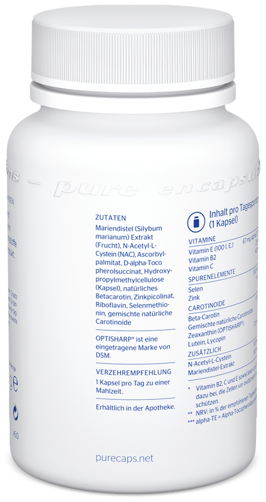 Mariendistel (Silybum marianum) Extrakt (Frucht), N-Acetyl-L-Cystein (NAC), Ascorbylpalmitat, D-alpha-Tocopherolsuccinat, Hydroxypropylmethylcellulose (Kapsel), natürliches Beta-Carotin, Zinkpicolinat, Riboflavin, Selenmethionin, gemischte natürliche Carotinoide