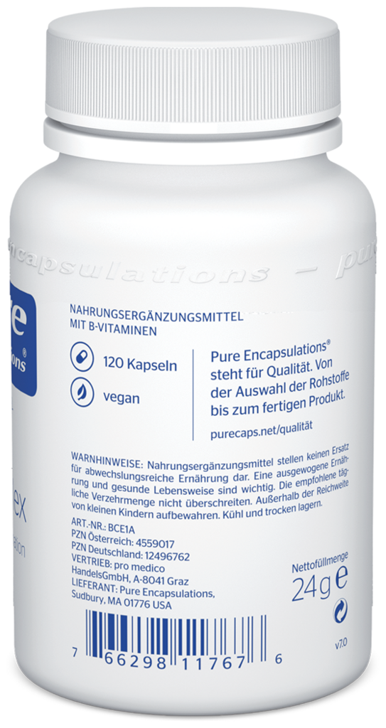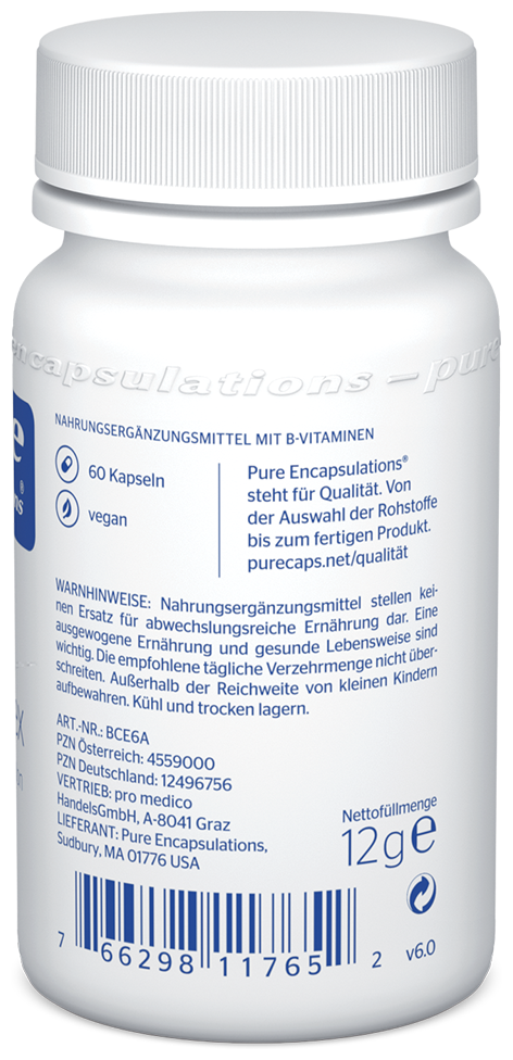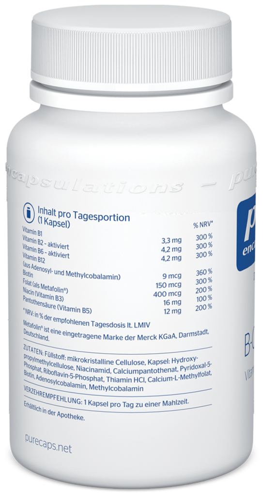 Füllstoff: mikrokristalline Cellulose, Kapsel: Hydroxypropylmethylcellulose, Niacinamid, Calciumpantothenat, Pyridoxal-5-Phosphat, Riboflavin-5-Phosphat, Thiamin HCl, Calcium-L-Methylfolat (Metafolin®), Biotin, Adenosylcobalamin, Methylcobalamin