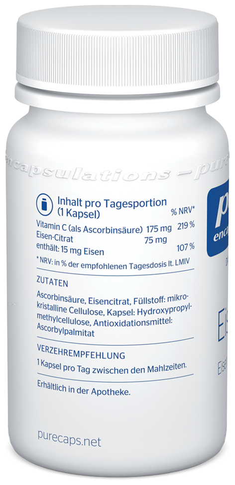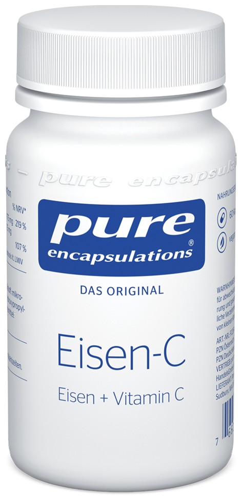 Eisen-C von Pure Encapsulations liefert sehr gut bioverfügbares Eisencitrat mit Vitamin C, das auch sehr gut verträglich ist. So kann der erhöhte Eisenbedarf, wie beispielsweise von Frauen und Ausdauersportlern ausgeglichen werden. Das vegane Eisenprodukt mit Vitamin C ist ideal für alle, die gezielt die Eisenversorgung verbessern möchten und bereits weitere Nahrungsergänzungen wie etwa B-Vitamine oder ein Multivitamin anwenden.