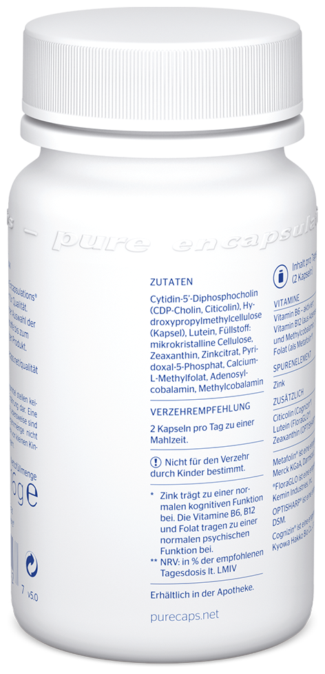 Cytidin-5’-Diphosphocholin (CDP-Cholin, Citicolin), Hydroxypropylmethylcellulose (Kapsel), Lutein, Füllstoff: mikrokristalline Cellulose, Zeaxanthin, Zinkcitrat, Pyridoxal-5-Phosphat, Calcium-LMethylfolat, Adenosylcobalamin, Methylcobalamin