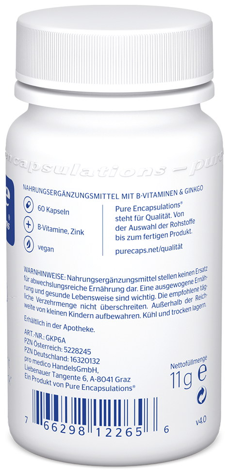 Füllstoff: mikrokristalline Cellulose, Hydroxypropylmethylcellulose (Kapsel), Ginkgo (Ginkgo biloba) Extrakt (Blatt, 50 : 1), Zinkcitrat, Pyridoxal-5-Phosphat, Calcium-L-Methylfolat, Adenosylcobalamin, Methylcobalamin
