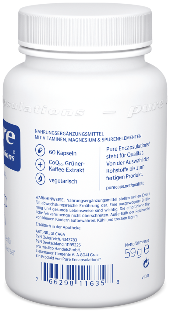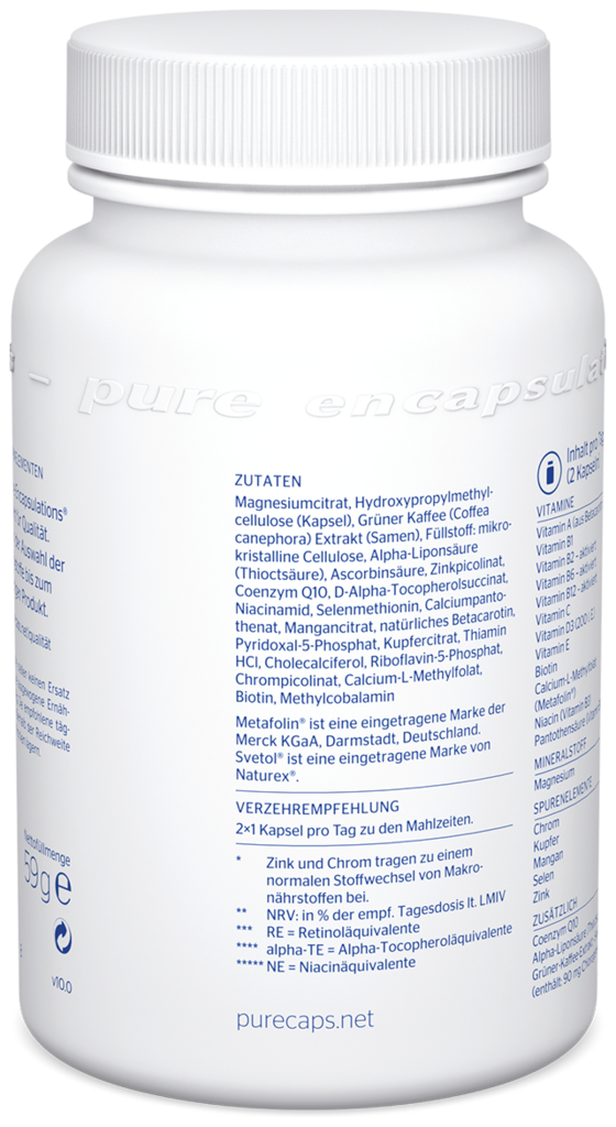 Magnesiumcitrat, Hydroxypropylmethylcellulose (Kapsel), Grüner Kaffee (Coffea canephora) Extrakt (Samen), Füllstoff: mikrokristalline Cellulose, Alpha-Liponsäure (Thioctsäure), Ascorbinsäure, Zinkpicolinat, Coenzym Q10, D-Alpha-Tocopherolsuccinat, Niacinamid, Selenmethionin, Calciumpantothenat, Mangancitrat, natürliches Beta-Carotin, Pyridoxal-5-Phosphat, Kupfercitrat, Thiamin HCl, Cholecalciferol, Riboflavin-5-Phosphat, Calcium-L-Methylfolat, Chrompicolinat, Methylcobalamin, Biotin