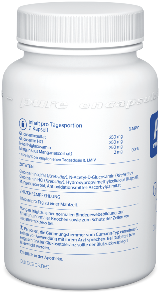 Glucosaminsulfat (Krebstier), N-Acetyl-D-Glucosamin (Krebstier), Glucosamin HCl (Krebstier), Kapsel: Hydroxypropylmethylcellulose, Manganascorbat, Antioxidationsmittel: Ascorbylpalmitat