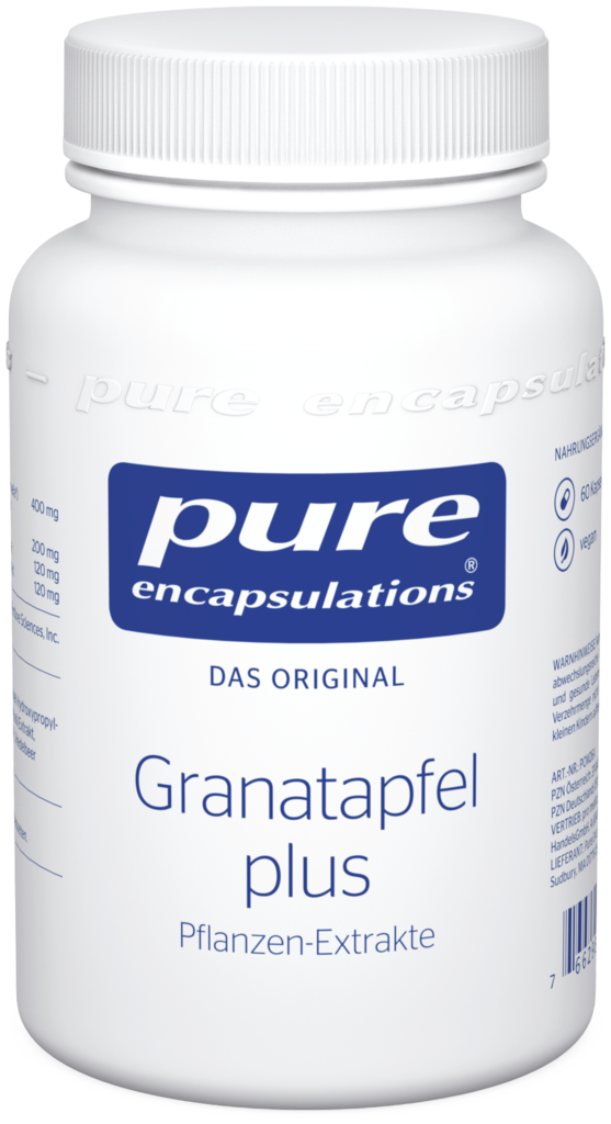 Der Granatapfel ist eine der ältesten Kulturpflanzen und seine Früchte haben seit jeher auch mythologische Bedeutungskraft. So ist die Granatapfelfrucht beispielsweise Symbol für Fruchtbarkeit, Liebe und Unsterblichkeit. Der Granatapfelextrakt in Pure Encapsulations® Granatapfel plus wurde auf Polyphenole sowie Punicalgin standardisiert und enthält die in den Früchten reichlich vorliegenden Nährstoffe. Das Produkt wurde außerdem mit Açai-, Cranberry- sowie Heidelbeerextrakt ergänzt.