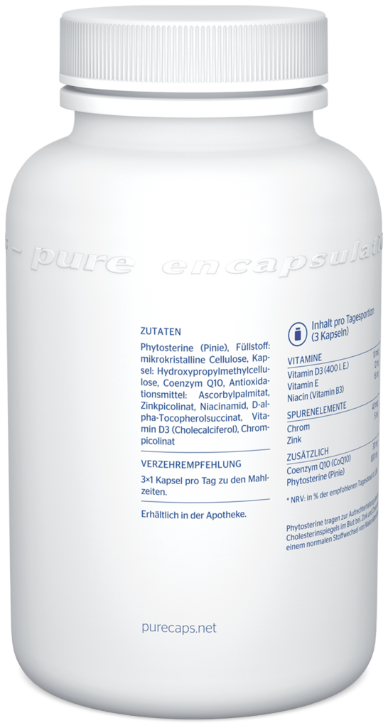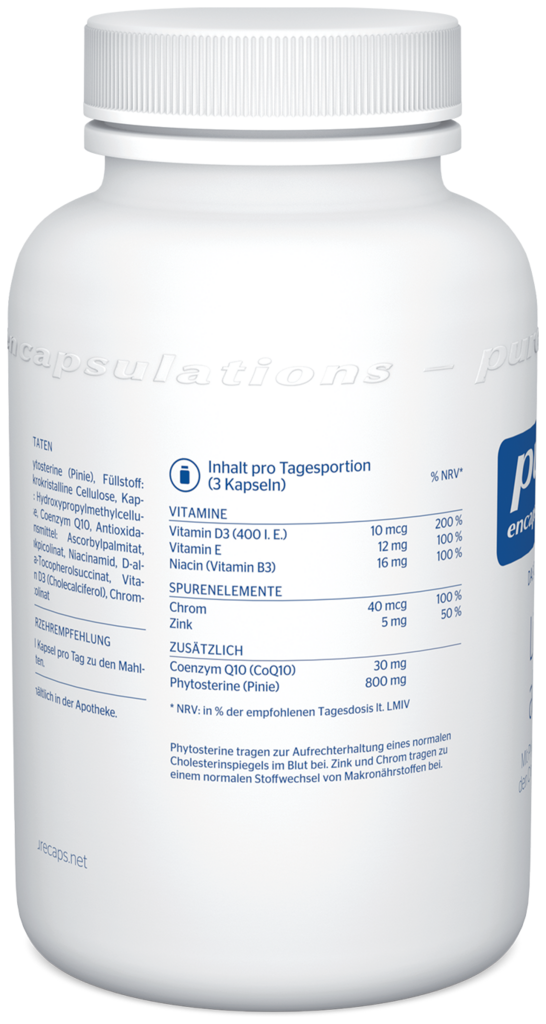 Phytosterine (Pinie), Füllstoff: mikrokristalline Cellulose, Kapsel: Hydroxypropylmethylcellulose, Coenzym Q10, Antioxidationsmittel: Ascorbylpalmitat, Zinkpicolinat, Niacinamid, D-alpha-Tocopherolsuccinat, Vitamin D3 (Cholecalciferol), Chrompicolinat