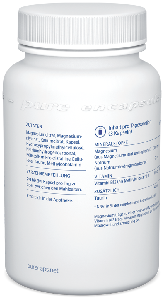 Magnesiumcitrat, Magnesiumglycinat, Kaliumcitrat, Kapsel: Hydroxypropylmethylcellulose, Natriumhydrogencarbonat, Füllstoff: mikrokristalline Cellulose, Taurin, Methylcobalamin