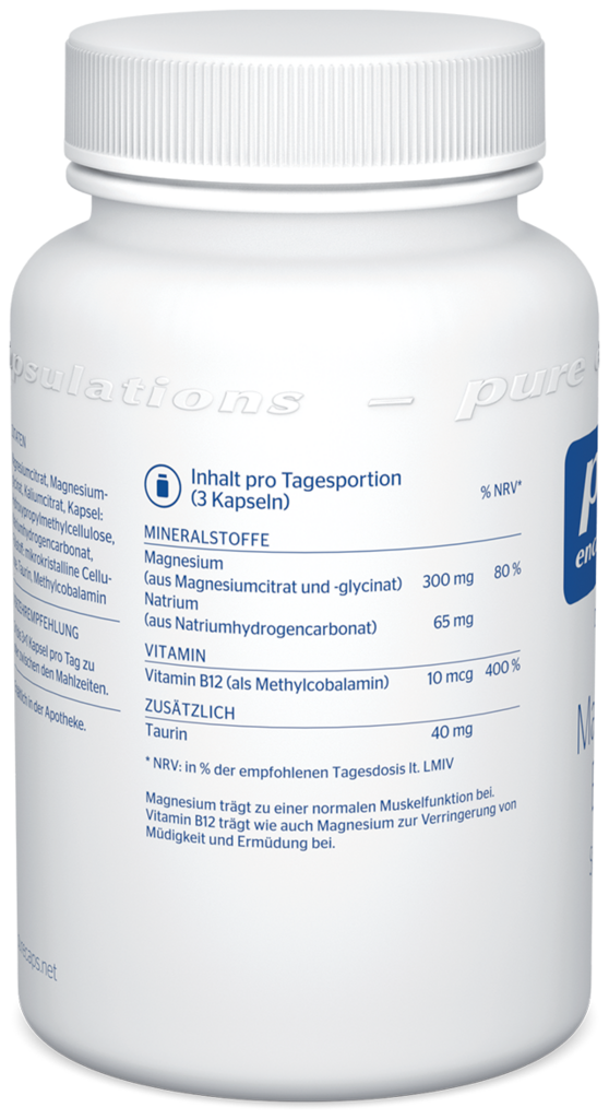 Magnesium Energy von Pure Encapsulations® versorgt deinen Körper mit den Mikronährstoffen, die du für das Training oder einen erfolgreichen Wettkampf benötigst. Denn gerade im Sport und bei hoher Muskelaktivität steigt der Bedarf an essenziellen Nährstoffen. Der Mineralstoff Magnesium ist für den Körper ein essenzieller Faktor für die gesunde Muskelfunktion, er sorgt für die Aufrechterhaltung des Elektrolytgleichgewichts und hat eine positive Wirkung auf den Energiestoffwechsel. Während Vitamin B12 auch für die nötige Energie sorgt unterstützt es zudem deine mentale Performance, indem es deiner psychischen Funktion und den Nerven unter die Arme greift. Damit du von diesen Effekten profitieren kannst, kommt es auf eine gesunde und ausgewogene Ernährung genauso an, wie auf einen individuellen Trainingsplan. Da sich durch das Training und auch durch das Schwitzen allerdings dein Mikronährstoffbedarf erhöht, macht es durchaus Sinn, deinen Körper auch mit hochwertigen Nahrungsergänzungsmitteln zu unterstützen.
