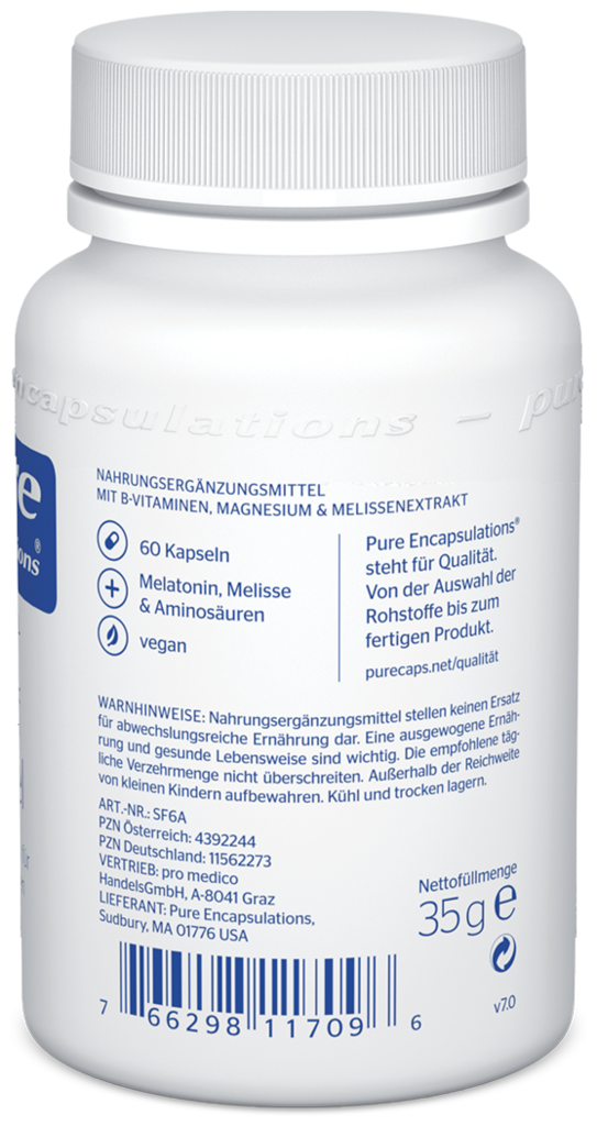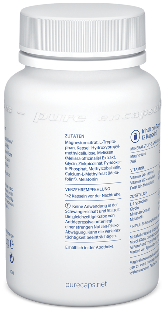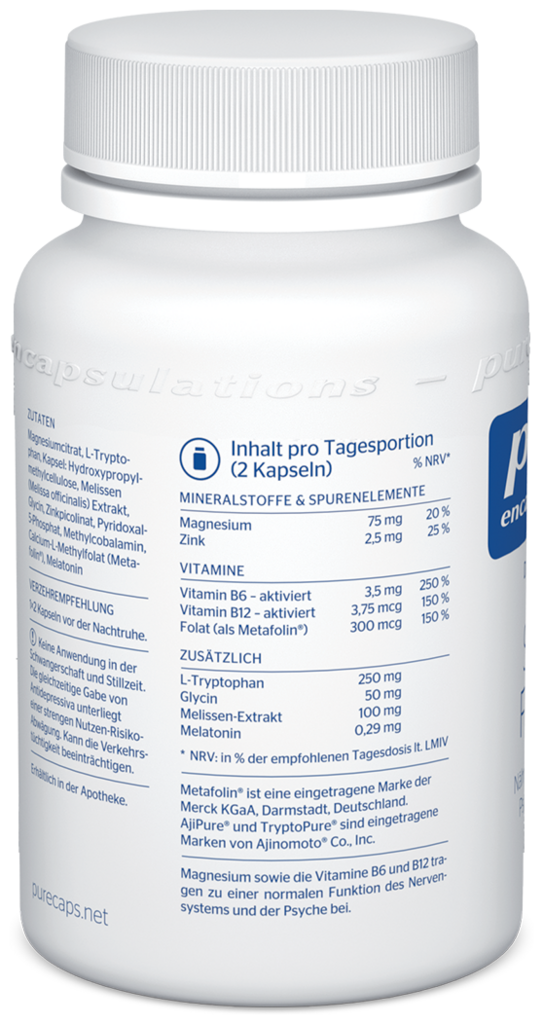 Magnesiumcitrat, L-Tryptophan, Kapsel: Hydroxypropylmethylcellulose, Melissen (Melissa officinalis) Extrakt, Glycin, Antioxidationsmittel: Ascorbylpalmitat, Zinkpicolinat, Pyridoxal-5-Phosphat, Methylcobalamin (0,1 %), Calcium-L-Methylfolat (Metafolin®), Melatonin