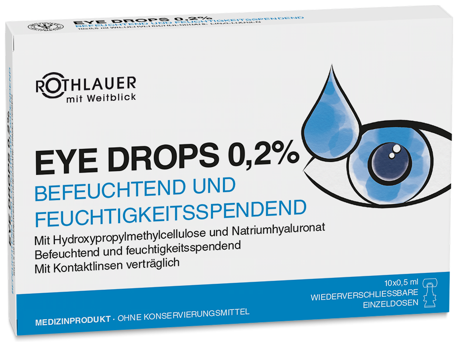 EYE DROPS 0,2% befeuchtet die Augenoberfläche langanhaltend. So werden trockene Augen in Zusammenhang mit langer Bildschirmarbeit, häufigem Blinzeln, medizinischen Behandlungen, Umwelteinflüssen (z.B. Klimaanlage, Wind und Sonne) sowie strapazierte Augen durch das Tragen von Kontaktlinsen dauerhaft gelindert.