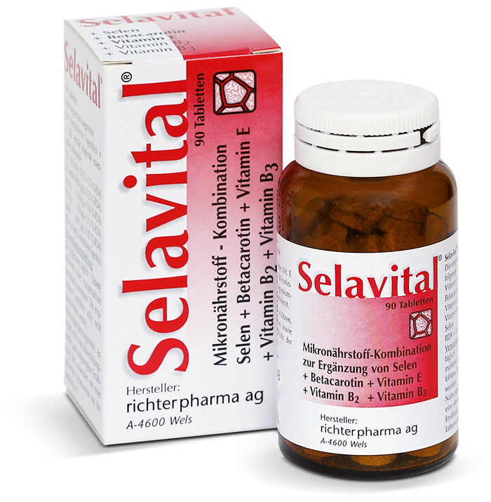 Selavital® ist ein Nahrungsergänzungsmittel mit Selen, Betacarotin, Vitamin E, Vitamin B2 und Vitamin B3. Selen trägt zur normalen Funktion des Immunsystems und der Schilddrüse bei. Vitamin E und Vitamin B2 schützen die Zellen vor oxidativem Stress und Vitamin B3 trägt zu einem normalen Energiestoffwechsel bei.