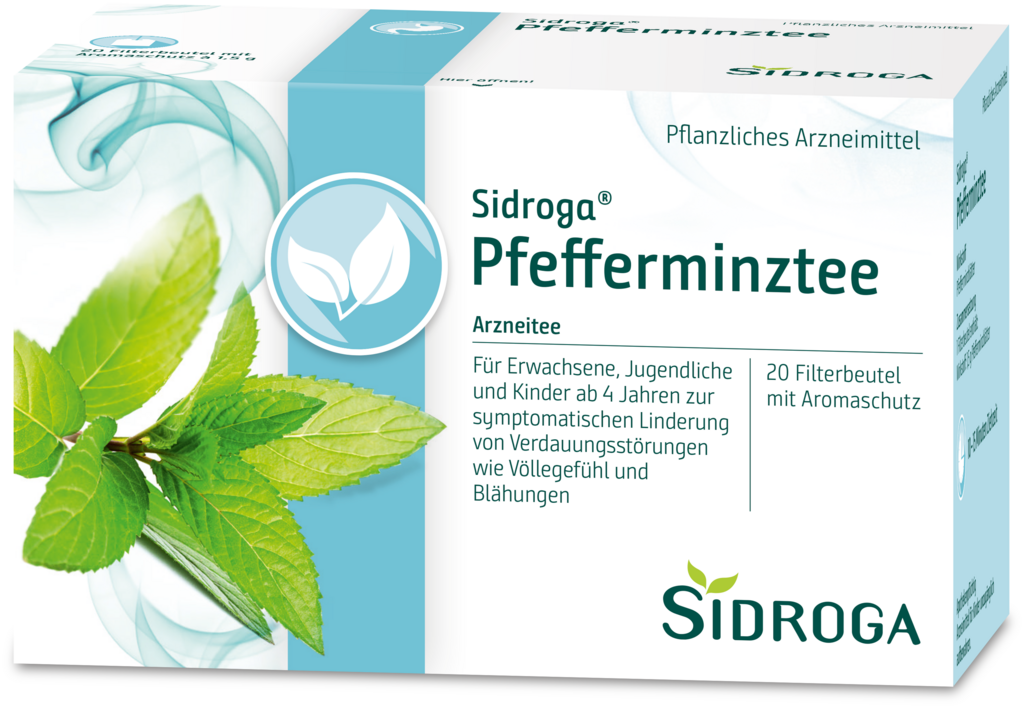 Sidroga Pfefferminztee ist ein traditionelles pflanzliches Arzneimittel zur symptomatischen Linderung von Verdauungsstörungen wie Völlegefühl und Blähungen.
