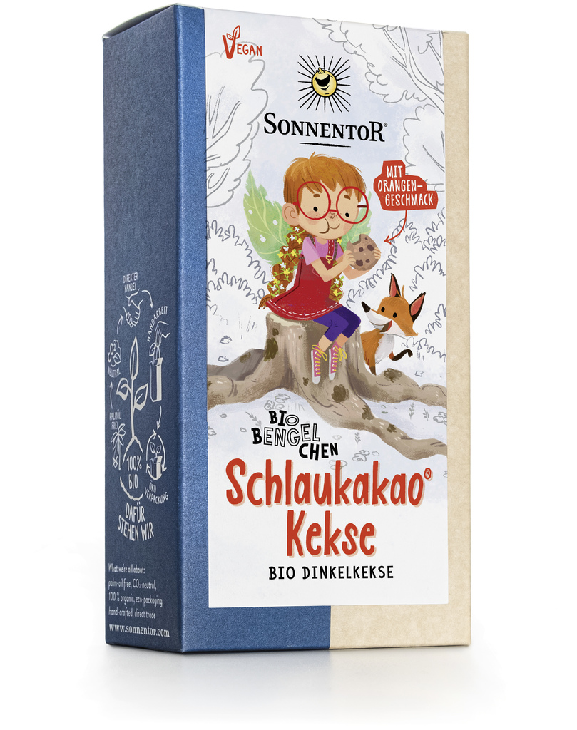 Du magst unseren Schlaukakao? Dann wirst du diese knusprige Nascherei lieben. Bio-Bengelchen Constanze hat den würzigen Kakao zu süßen Keksen geformt und mit Orangengeschmack verfeinert. Ganz ohne Palmöl und ausschließlich mit Kokosblütenzucker gesüßt. Praktisch für unterwegs und perfekt für große und kleine Krümelmonster.