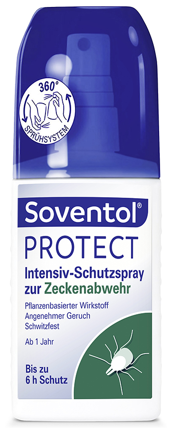 Wasserbeständig, schwitzfest und gut verträglich: Soventol® Protect leistet eine effektive Unterstützung zur Zeckenabwehr. Denn das Intensiv-Schutzspray kann Zecken bis zu 6 Stunden lang fernhalten.