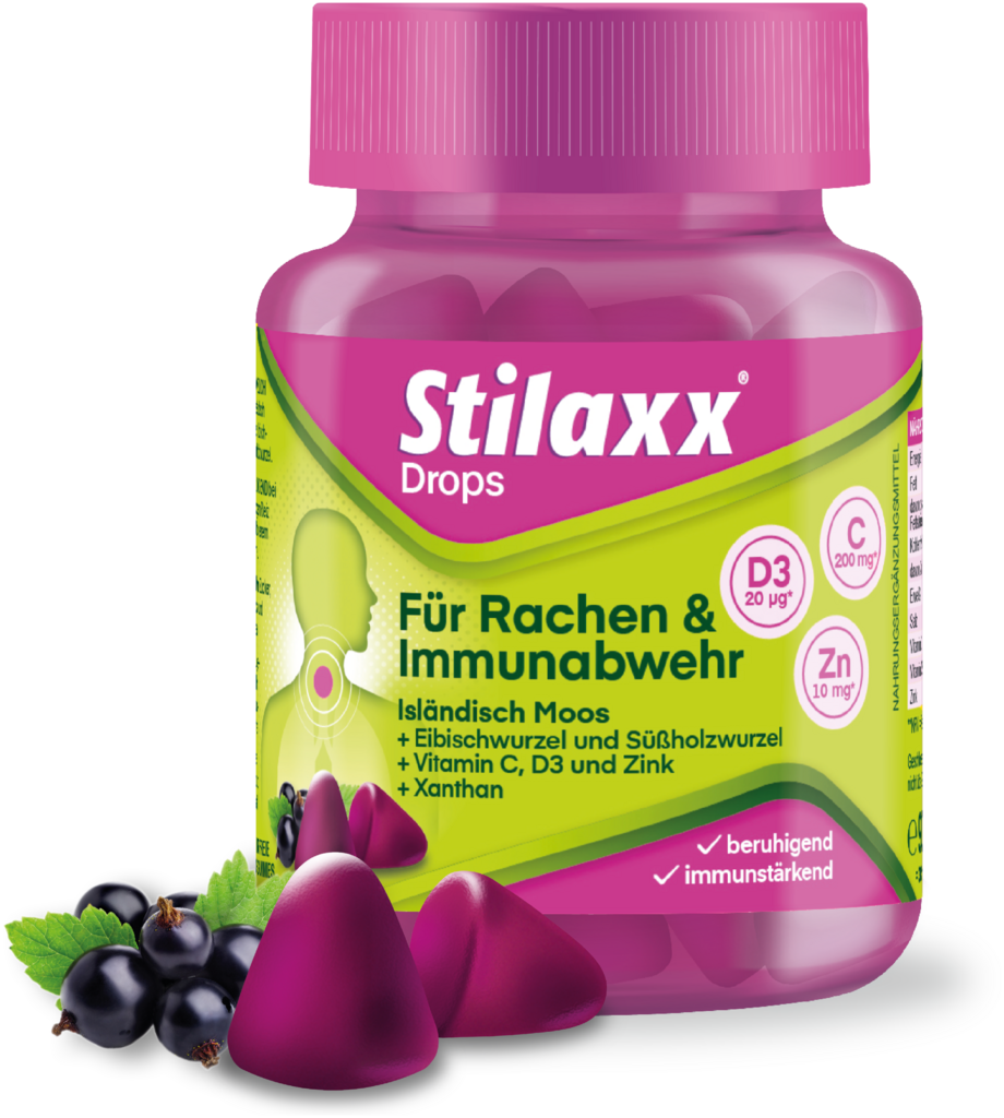 Stilaxx® Drops vereint die bewährte Stilaxx® Formel mit den Immunboostern Vitamin C, D3 und Zink – täglich in der Erkältungszeit. Die Schleimstoffe der Stilaxx® Formel, bestehend aus Isländisch Moos, Eibischwurzel und Süßholzwurzel, haben einen beruhigenden Effekt auf den trockenen und gereizten Rachen. Vitamin C, D3 und Zink unterstützen die Funktion des Immunsystems. Vitamin C und Zink schützen die Zellen, wie z. B. Schleimhautzellen, vor oxidativem Stress.