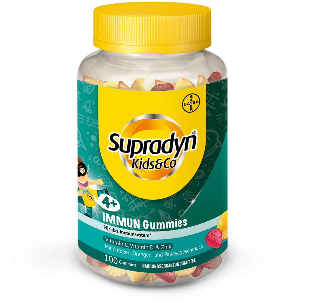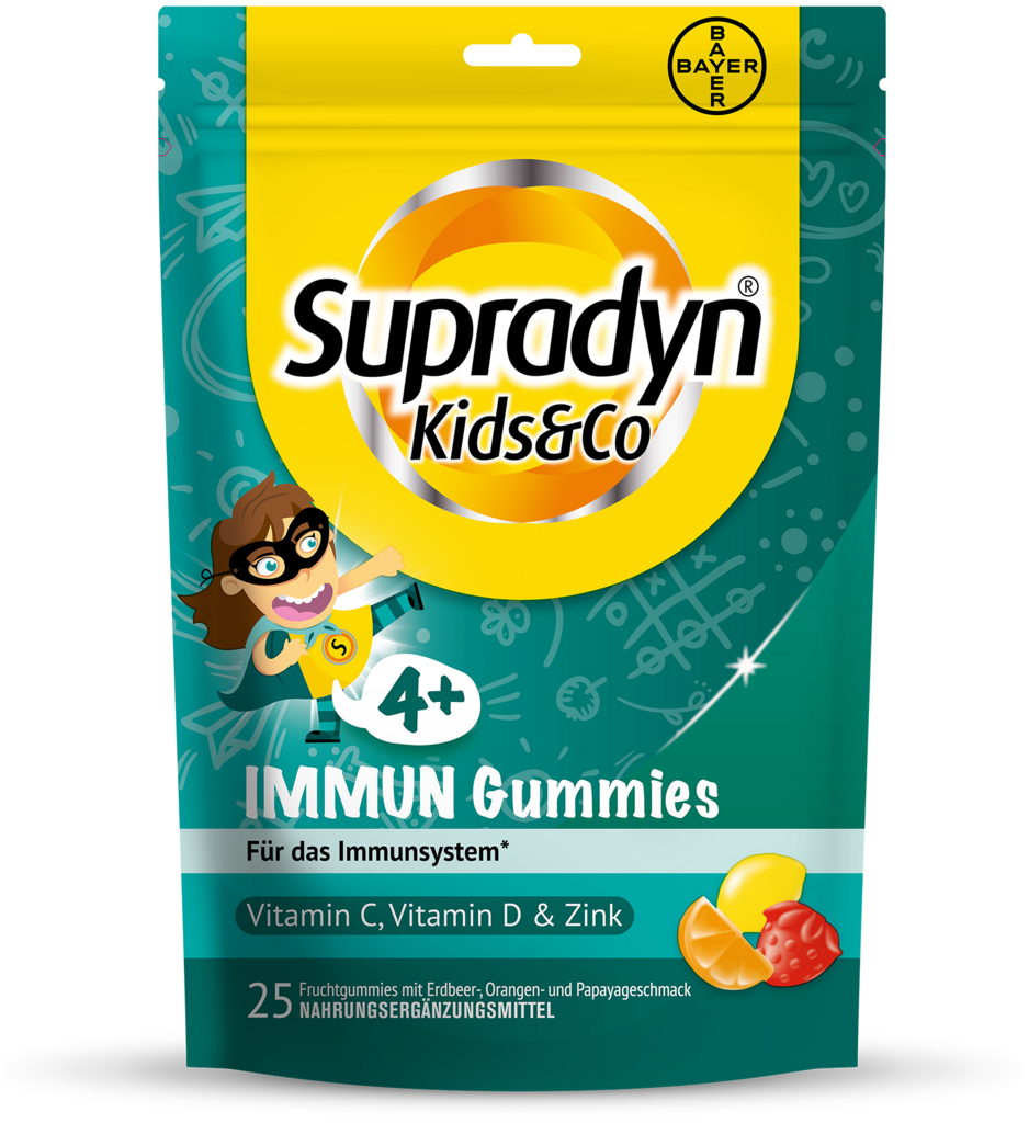 Supradyn® IMMUN wurde speziell zur Unterstützung der Abwehrkräfte entwickelt und bietet Produkte für die ganze Familie: Brausetabletten für Erwachsene sowie fruchtige Toffees und Gummies, die Groß und Klein schmecken und schon für Kinder ab 4 Jahren geeignet sind.