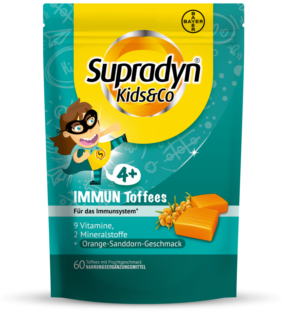 Supradyn® IMMUN wurde speziell zur Unterstützung der Abwehrkräfte entwickelt und bietet Produkte für die ganze Familie: Brausetabletten für Erwachsene sowie fruchtige Toffees und Gummies, die Groß und Klein schmecken und schon für Kinder ab 4 Jahren geeignet sind.