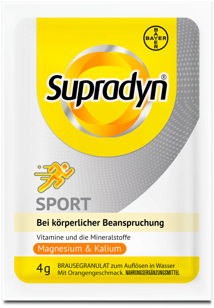 Eine optimale Regeneration ist für eine Leistungssteigerung wichtig. Das Auffüllen der Energie- und Nährstoffspeicher sowie ausreichende Flüssigkeitszufuhr unterstützen den Köper in der Ruhephase. Die ausgewogene Kombination, der in Supradyn® SPORT enthaltenen Mikronährstoffe hilft, den durch Schwitzen entstanden Elektrolytverlust auszugleichen und die Speicher mit ausgewählten Vitaminen und Mineralstoffen wieder aufzufüllen. Zusätzlich tragen die Vitamine B6, B12, Folsäure und C zur Verringerung von Müdigkeit und Ermüdung bei.
