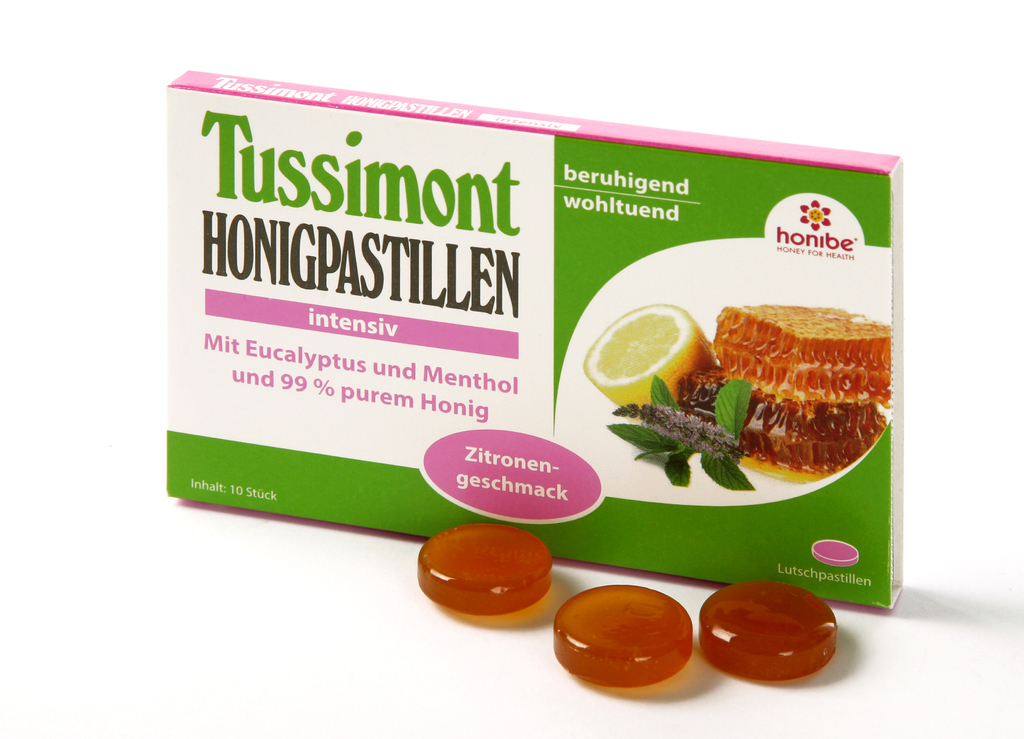 TUSSIMONT Honigpastillen intensiv mit Eucalyptus und Menthol bestehen zu 99 % aus purem Honig und schmecken angenehm frisch nach Zitrone. Besonders in der Erkältungszeit entfalten diese Honigpastillen ihre wohltuende Wirkung beim Zergehenlassen im Mund. TUSSIMONT Honigpastillen intensiv sind für Erwachsene und Kinder ab 5 Jahren geeignet