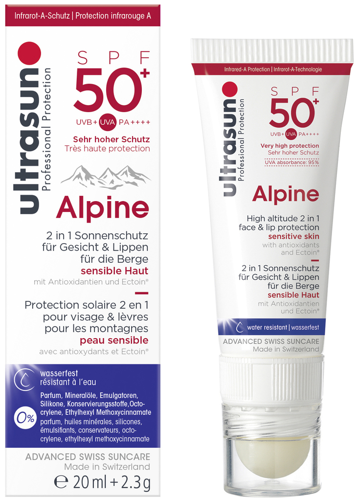 Sehr schnell absorbierende, spezielle Kombination von lamellarem UVA- und UVB-Breitband-Schutz mit SPF50+, GSP für Infrarot-Schutz, Titandioxid zum Schutz vor blauem Licht und Ectoin. Der wasserfreie Stick schützt sensible Lippen und exponierte Hautpartien wie Nase und Wangen vor Sonne, Wind und Kälte. Ideal für die extremen Wetterbedingungen in den Bergen.
