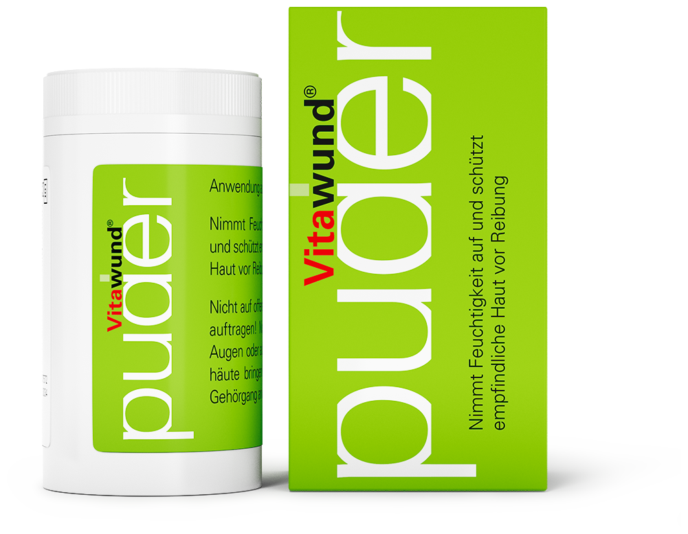 Vitawund Puder nimmt aufgrund seines austrocknenden Effektes Feuchtigkeit auf und schützt empfindliche Hautpartien wie Hautfalten, Achselhöhlen oder Zehenzwischenräume vor Reibung.